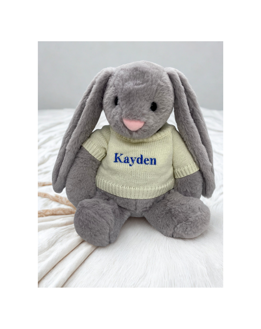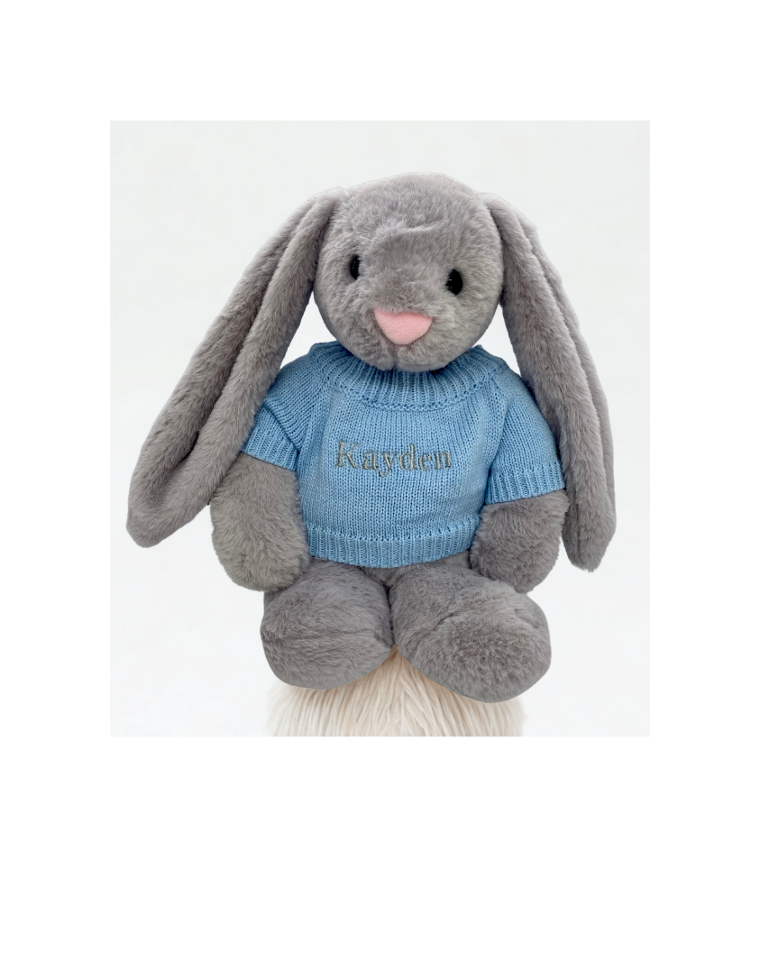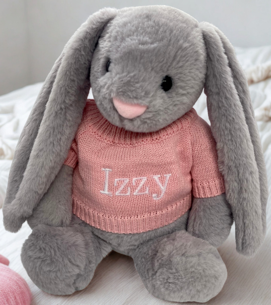 Make your rabbit truly unique with an optional personalised knitted jumper. Add the name you would like in the order notes at checkout, along with your chosen thread colour. Perfect as a thoughtful gift or special keepsake.