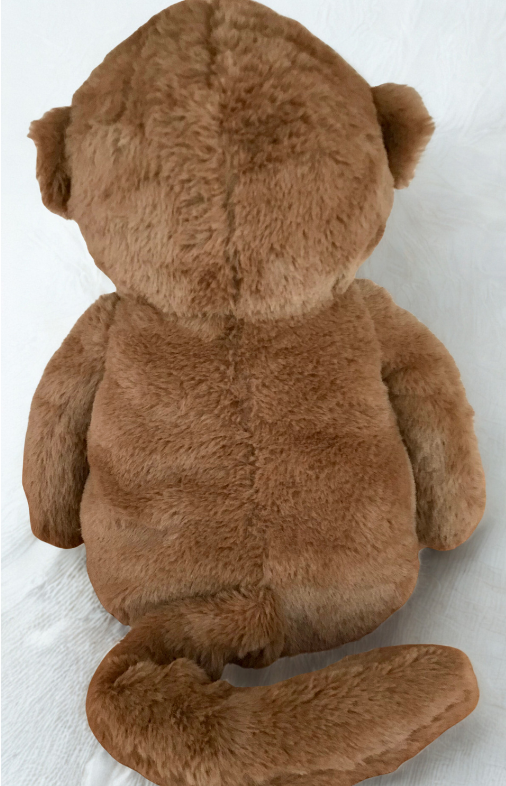 The weight is created using small glass beads secured inside fabric sacks. These are safely positioned inside all four feet and a larger sack in the lower body, while the remainder of the monkey is filled with soft plush stuffing. This ensures the bear is both comfortably weighted and wonderfully cuddly.